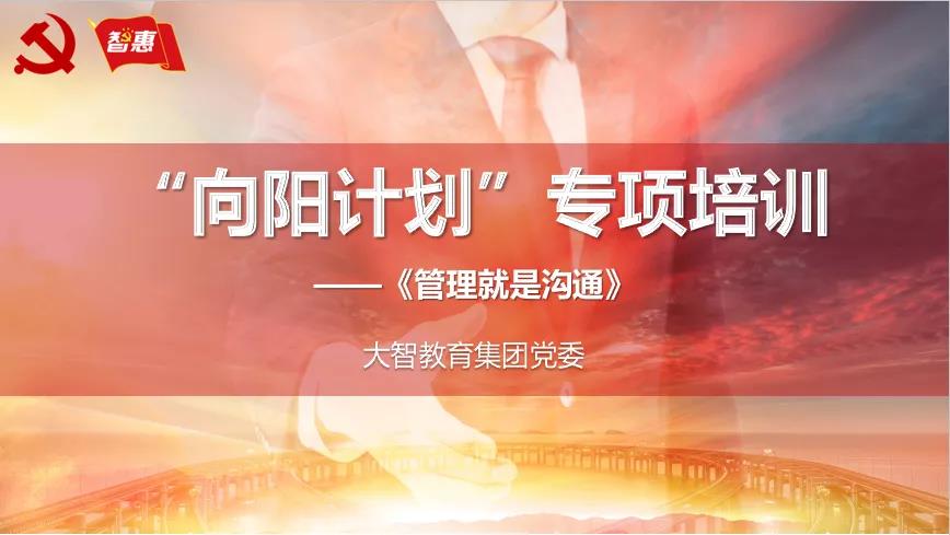 為進(jìn)一步提高黨員骨干的綜合素質(zhì),落實(shí)好“三個(gè)著力凝團(tuán)隊(duì)”,把業(yè)務(wù)骨干培養(yǎng)成黨員,把黨員培養(yǎng)成業(yè)務(wù)骨干,把黨員業(yè)務(wù)骨干培養(yǎng)成管理人才,為集團(tuán)干部隊(duì)伍輸送新生力量,集團(tuán)黨委決定從一線選拔了一批思想積極向上、愿意扎根大智平臺(tái)的優(yōu)秀黨員,進(jìn)行“向陽(yáng)計(jì)劃”專(zhuān)項(xiàng)培訓(xùn)。
