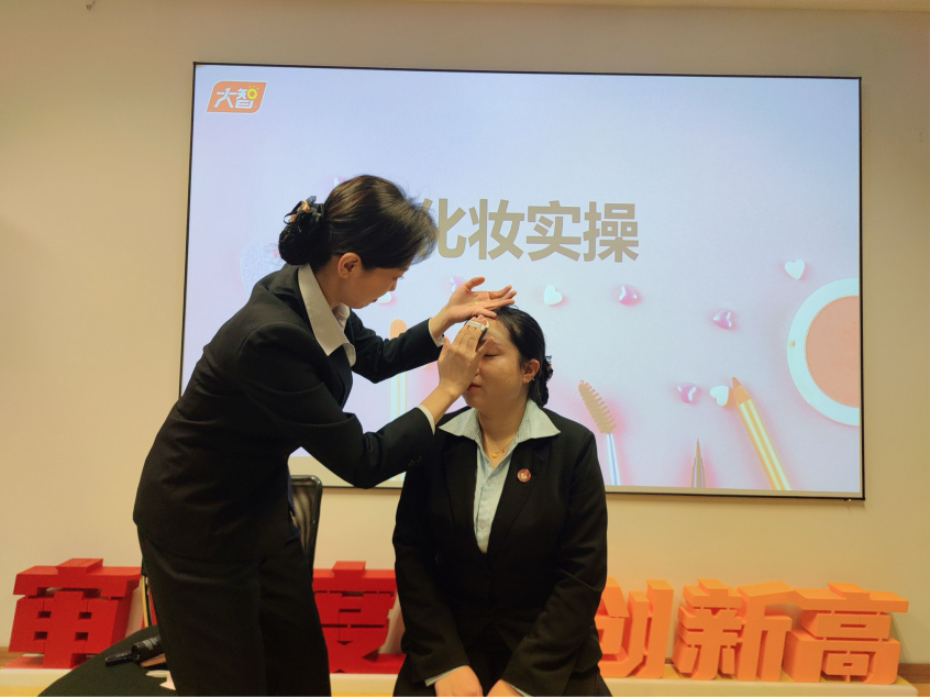 大智控股集團市場部總監(jiān)陳婷婷針對學科導師的職業(yè)特性,傳授了快速高效的日常妝容打造技巧,包括底妝選擇、眼妝自然提亮、唇色搭配等實用知識。婷婷總監(jiān)提到:“化妝不僅是外在美的提升,更是對自我和他人的尊重。作為學科導師,妝容應簡潔大方,既展示專業(yè)性,又拉近與學生的距離?!辈F場進行化妝實操。