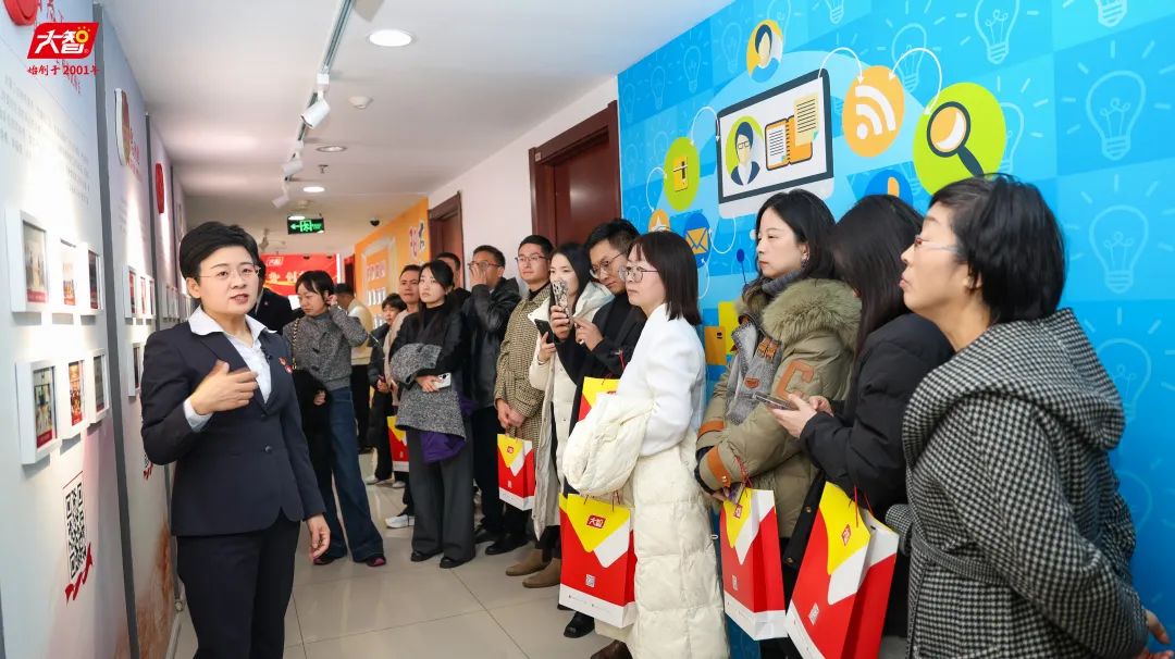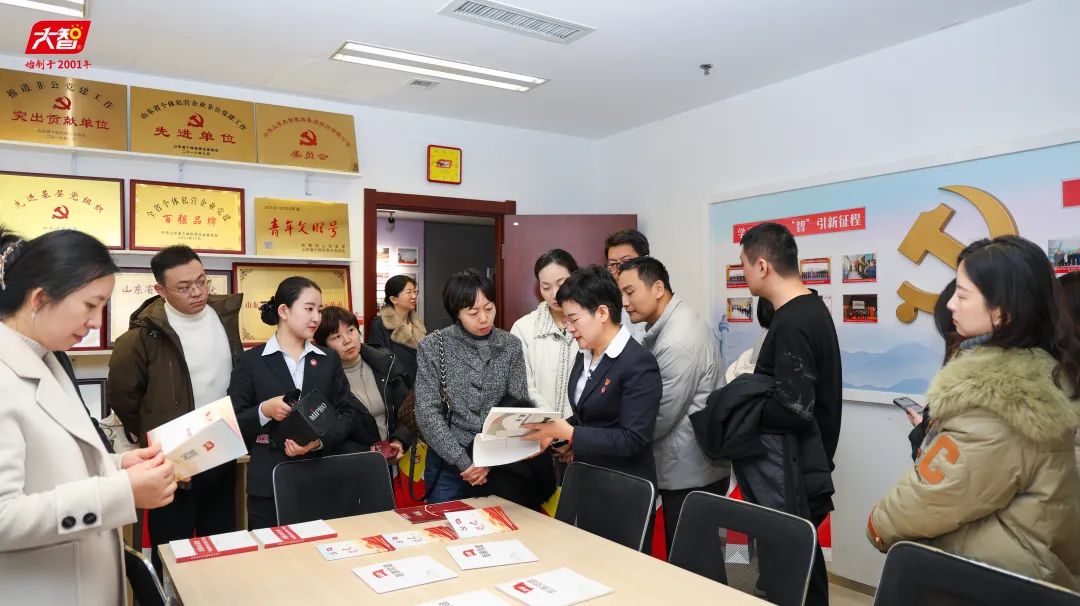 王現芹帶領大家參觀了黨建長廊,詳細介紹了大智組織架構、企業文化等相關情況,以及“智惠黨建一三九”黨建工作模式,黨建引領下的“一帶一促”群團建設理念和“智惠+”群團建設模式。