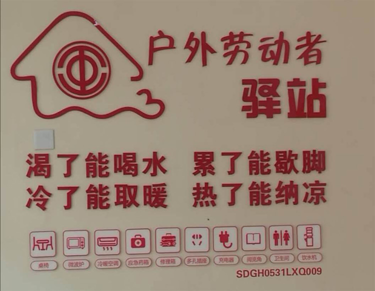 據悉,“戶外勞動者驛站”是山東省總工會在全省范圍內持續推動建設的重點項目,旨在為廣大戶外勞動者提供服務。驛站建成后,將以環衛工、快遞員、協管員等戶外職工為主要服務對象,內部設飲水機、空調、微波、沙發等生活設施,配備手機充電器、便民工具箱、醫療藥箱等,可有效解決戶外職工的飲水、避暑取暖、如廁、手機充電等生活實際需求,為廣大戶外勞動者提供實實在在的溫暖與關懷。