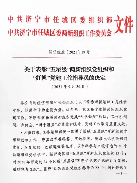 近日,中共濟(jì)寧市任城區(qū)委組織部、中共濟(jì)寧市任城區(qū)委兩新組織工作委員會(huì)發(fā)布《關(guān)于表彰“五星級(jí)”兩新組織黨組織和“紅帆”黨建工作指導(dǎo)員的決定》(濟(jì)任組發(fā)〔2021〕19號(hào))有關(guān)規(guī)定,大智濟(jì)寧區(qū)域黨支部榮獲任城區(qū)“五星級(jí)”黨組織稱號(hào)!