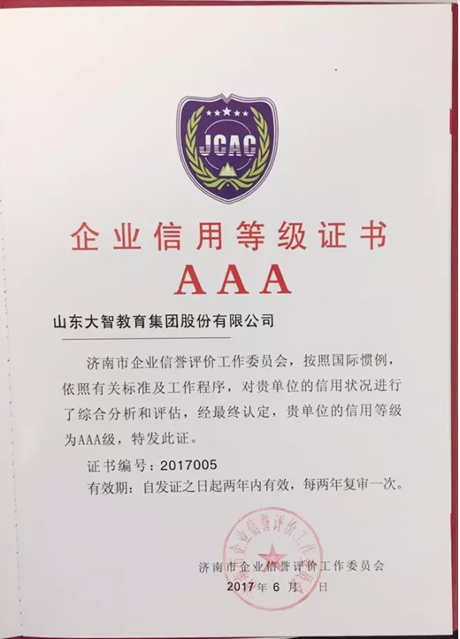 近日,經濟南市企業信譽評價工作委員會嚴格審核與評估,大智教育集團被評定為企業信用等級AAA級,按照企業信用等級標準,AAA級為最高信用等級。