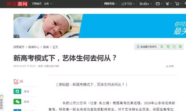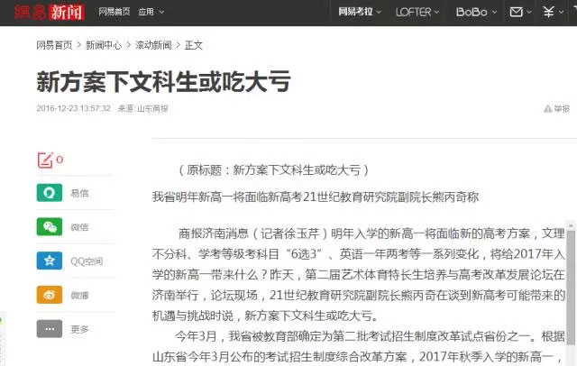 網易新聞連發兩文,引用《都市女報》、《山東商報》對于論壇的報道,指出新高考改革方案文科生或吃大虧。