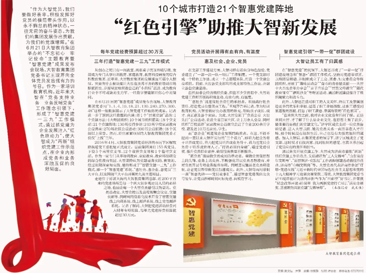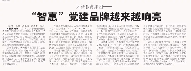 07月04日,《大眾日報》也對大智黨建工作進行報道,指出大智“智惠黨建”品牌越來越響亮。