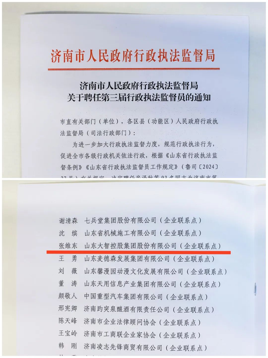 1月15日,濟南市人民政府行政執法監督局印發《關于聘任第三屆行政執法監督員的通知》,大智控股集團創始人、董事長張維東被聘為濟南市行政執法監督員,聘期三年。