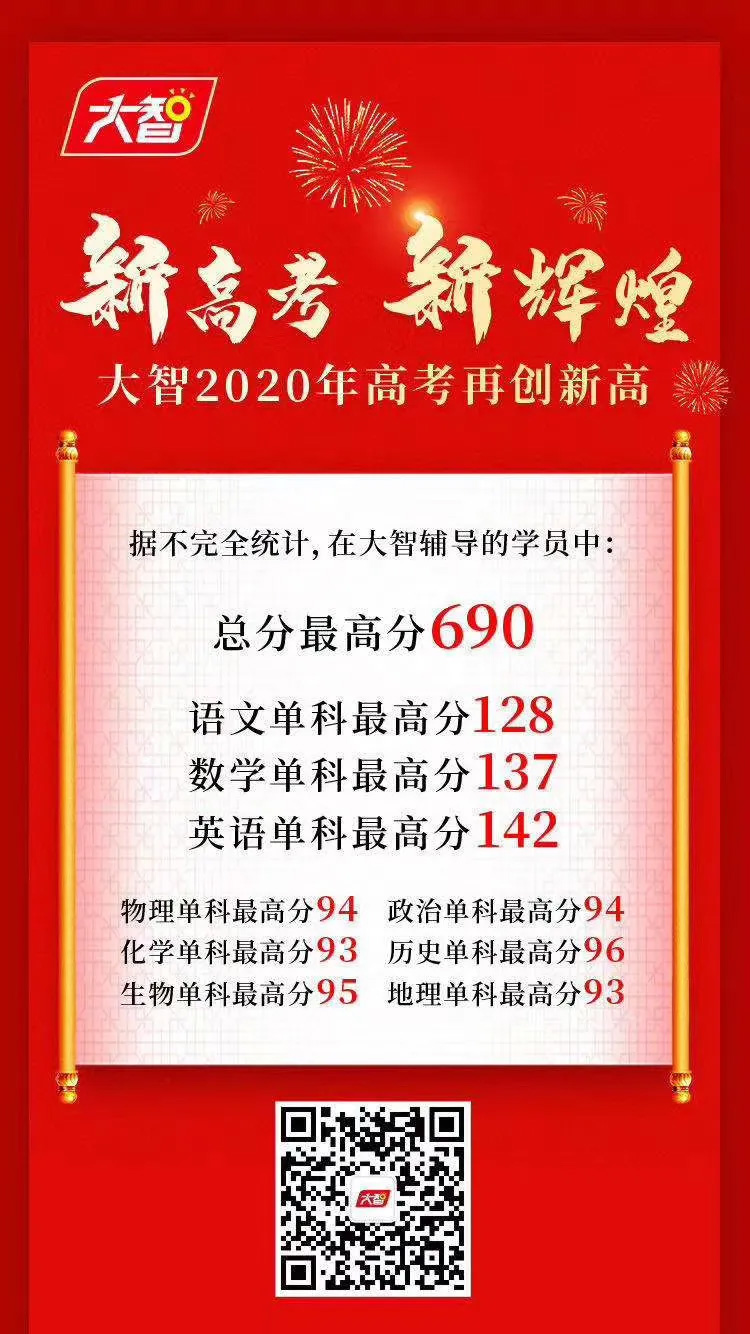 9. 2020年,大智中高考再創新高。據不完全統計,在大智輔導的高考學員中總分最高分690分,高考科目中語文單科最高分128分,數學單科最高分137分,英語單科最高分142分;等級考科目中物理單科最高分94分,化學單科最高分93分,生物單科最高分95分,政治單科最高分94分,歷史單科最高分96分,地理單科最高分93分。中考學員的進步率、升學率、滿意率等各項指標也在各地市位居前列。