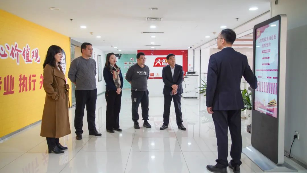 昌舉岡帶領大家參觀了黨建長廊,詳細介紹了大智組織架構、企業文化等相關情況,以及“智惠黨建一三九”黨建工作模式,黨建引領下的“一帶一促”群團建設理念和“智惠+”群團建設模式。大家對大智的黨建工作給予了高度評價。