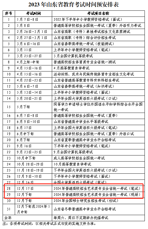 據山東省招生考試院發布的通知安排,2024年普通高校招生藝術類專業全省統一考試(筆試)將于2023年12月17日舉行,2023年12月下旬舉行2024年普通高校招生藝術類專業全省統一考試(現場)。