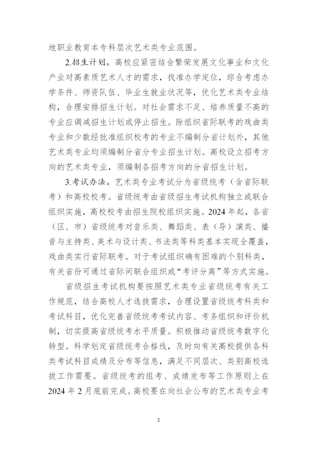 3.平穩做好藝術類考試招生。各地要認真落實藝術類專業考試招生改革部署,進一步加強省級統考能力建設,考試科類基本實現全覆蓋。要對照有關工作規范,完善省級統考科目和內容,優化考試組織和流程,推進省級統考提質增效。要科學制定藝術類專業招生錄取辦法,確保改革平穩落地。少數專業特色鮮明、人才培養質量較高的藝術院校,經省級教育行政部門批準可在省級統考基礎上組織個別專業校考。有關高校要結合人才培養定位,科學制定校考專業考試招生辦法,加強與省級統考銜接,合理確定校考形式及內容。2024年起,高校高水平藝術團不再從高校招生環節選拔,由有關高校從在校生中遴選培養。