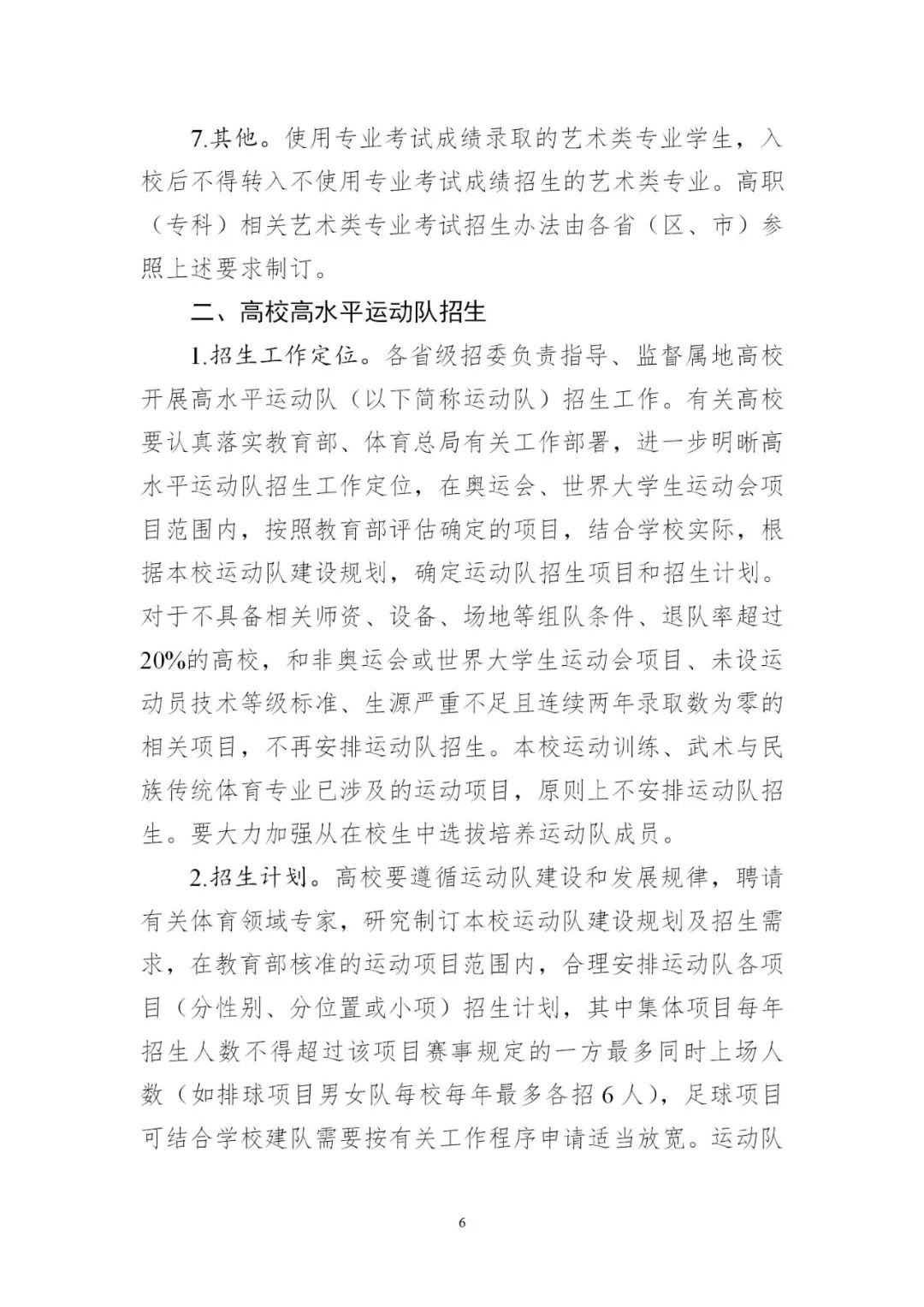 高校藝術類專業、高水平運動隊、保送生招生工作嚴格按照本通知要求執行。教育部授權各地各高校組織的單獨招生、強基計劃、高校專項、綜合評價、拔尖創新人才選拔培養等考試招生工作參照執行。本通知未盡事宜按照當年有關招生工作規定執行。請各省級教育行政部門將本通知轉發至本行政區域內有關高校。