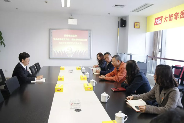03月28日,市扶貧辦宣傳信息組黨支部書記張婉,市扶貧辦金融合作組黨支部書記徐磊一行7人蒞臨大智開展03月主題黨日活動,大智控股集團黨委書記王現芹熱情接待。