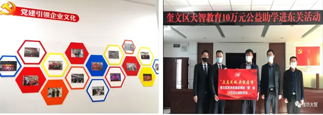 大智控股集團黨委自成立以來,始終堅持“黨務支持業務,業務反哺黨務”的工作理念,創新開展黨建工作。在集團黨委的指導下,濰坊區域黨支部逐步形成支部特色工作法——“智紅鳶都一三三六”支部工作法,不忘初心跟黨走,牢記使命勇擔當,充分發揮黨組織的戰斗堡壘作用和黨員的先鋒模范作用;在全面抗擊新冠疫情過程中,積極踐行社會責任,聯合奎文區東關街道共同發起“送課進‘疫’線公益助學”活動,捐贈助學金共10萬元。