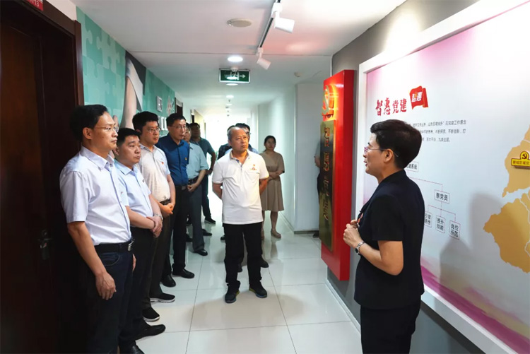 大智控股集團黨委書記王現芹首先帶領大家參觀了大智黨群陣地,詳細介紹了大智“智惠黨建一三九”工作模式以及黨建引領下的大智 “一帶一促”群團建設理念和“智惠+”群團建設模式。
