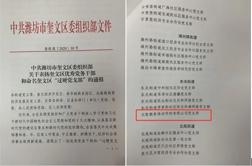 近日,在《中共濰坊市奎文區委組織部關于表揚奎文區優秀黨務干部和命名奎文區“過硬黨支部”的通報》中,大智濰坊區域黨支部被評為“過硬黨支部”。大...