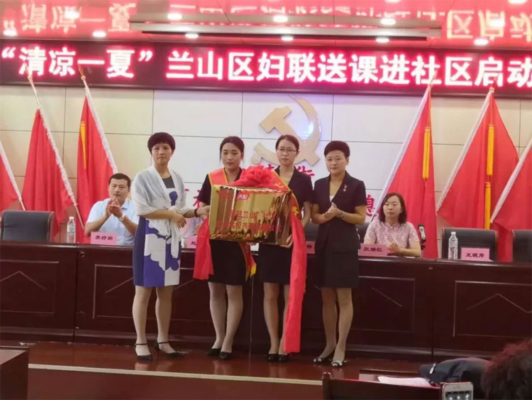 蘭山區(qū)柳青街道黨工委宣統(tǒng)委員王靜和大智教育集團黨委書記、副總裁、婦委會主任、好媽媽俱樂部主席王現芹為啟動儀式揭牌