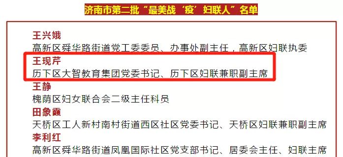 近日,濟(jì)南市婦聯(lián)公布了第二批最美戰(zhàn)“疫”巾幗典型,大智控股集團(tuán)黨委書記、婦聯(lián)主席王現(xiàn)芹被評為濟(jì)南市第二批“最美戰(zhàn)‘疫’婦聯(lián)人”。在疫情防控第...