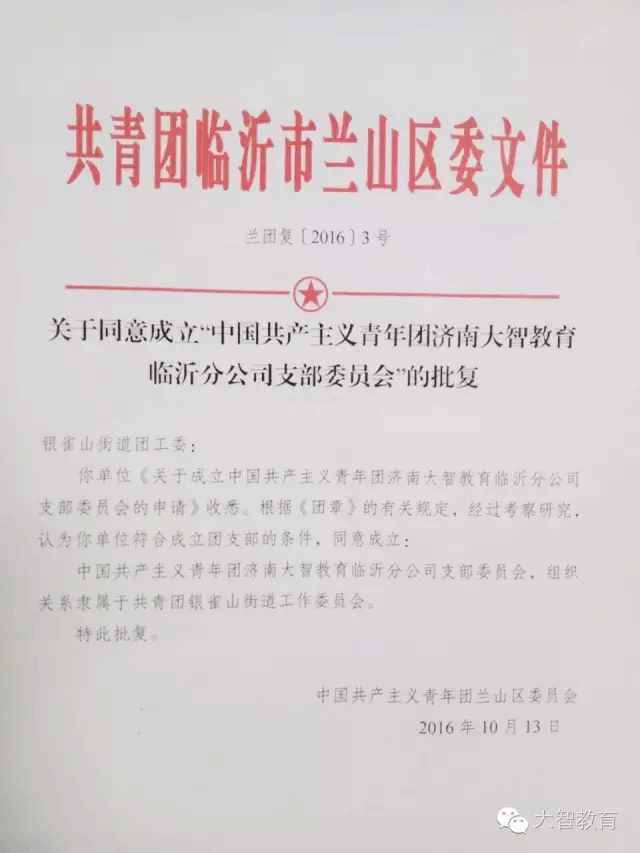 10月13日,中國(guó)共產(chǎn)主義青年團(tuán)蘭山區(qū)委員會(huì)正式批復(fù)同意成立“中國(guó)共產(chǎn)主義青年團(tuán)濟(jì)南大智控股臨沂分公司支部委員會(huì)”。目前,濟(jì)南大智控股服務(wù)集團(tuán)有限公司臨沂分公司正在積極籌建團(tuán)支部班子并組織開(kāi)展各項(xiàng)團(tuán)建工作。