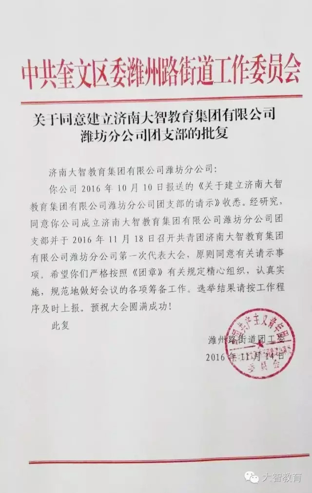 繼2016年10月10日大智淄博分公司黨支部成立之后,10月16日,共青團張店區馬尚鎮委員會正式批復同意成立共青團濟南大智教育服務集團有限公...